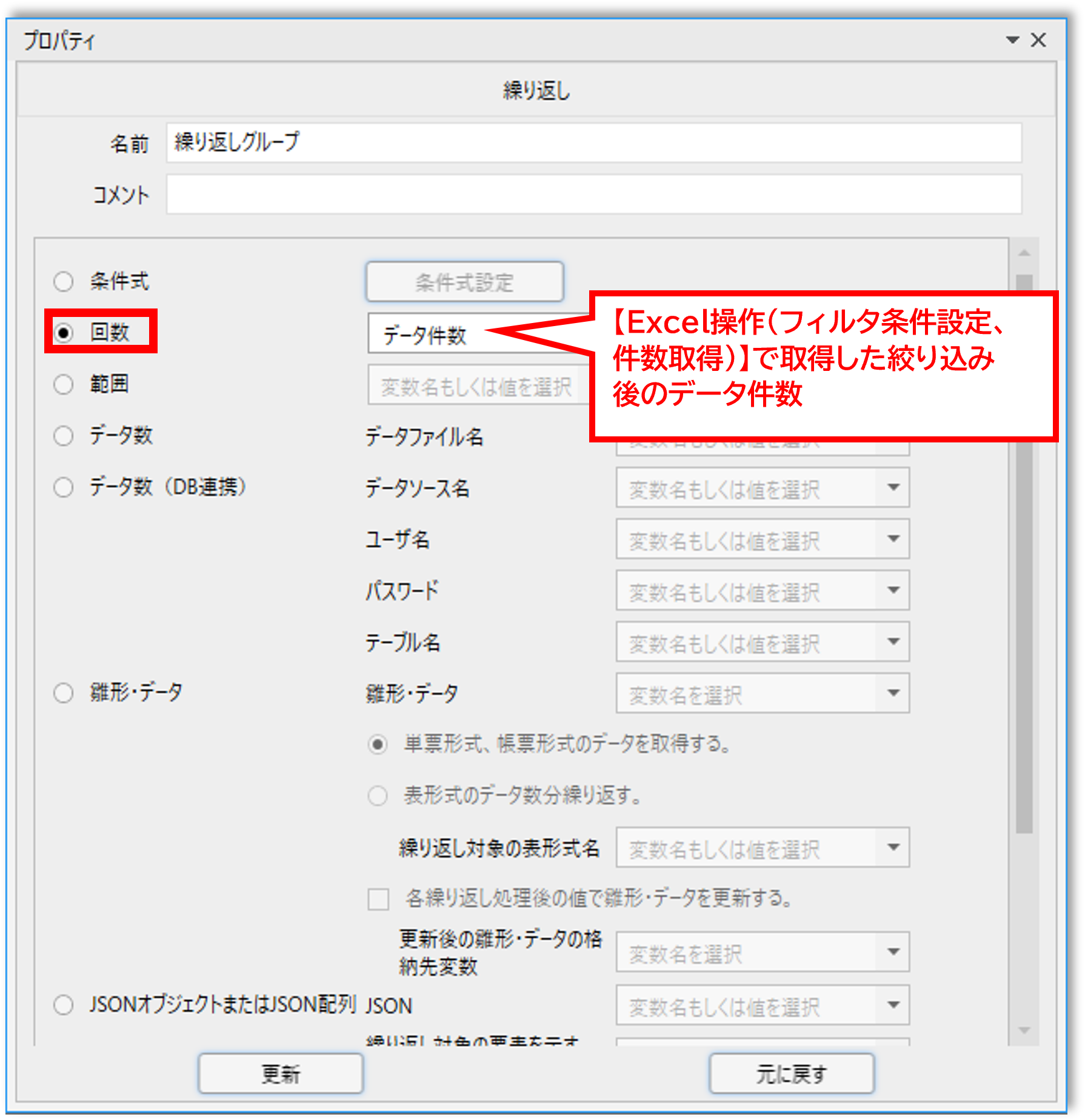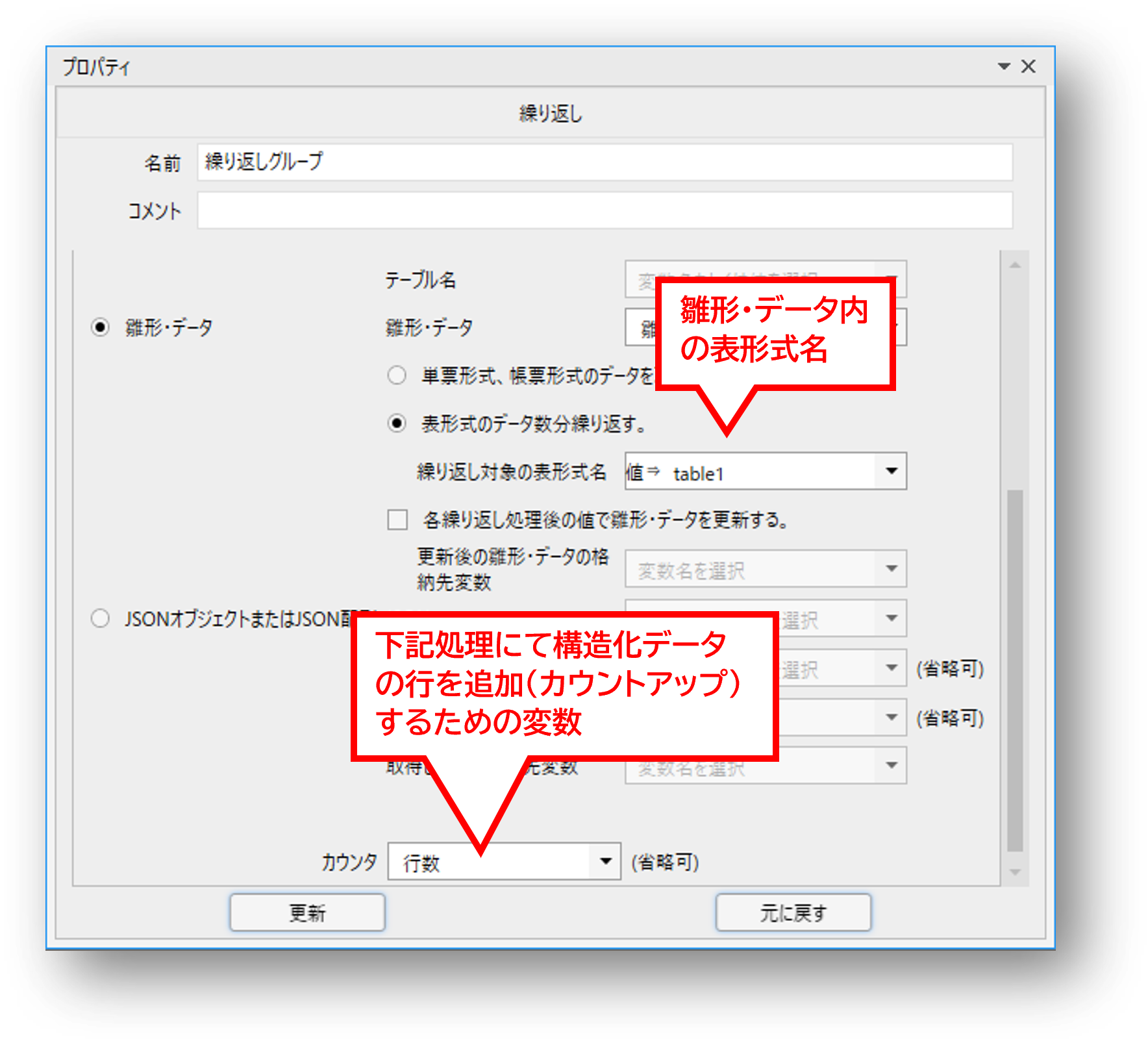 ※「雛形・データ」ライブラリを使用する場合、繰り返しの度にExcelにアウトプット(転記元Excelの明細部分から取得した値を転記先Excelに貼り付け)するのではなく、構造化データを都度更新し、繰り返し終了後に転記先Excelに一気に書き込みます。あらかじめ列名が指定されたExcelファイルを用意し、これに合わせた構造化データを作成させます。