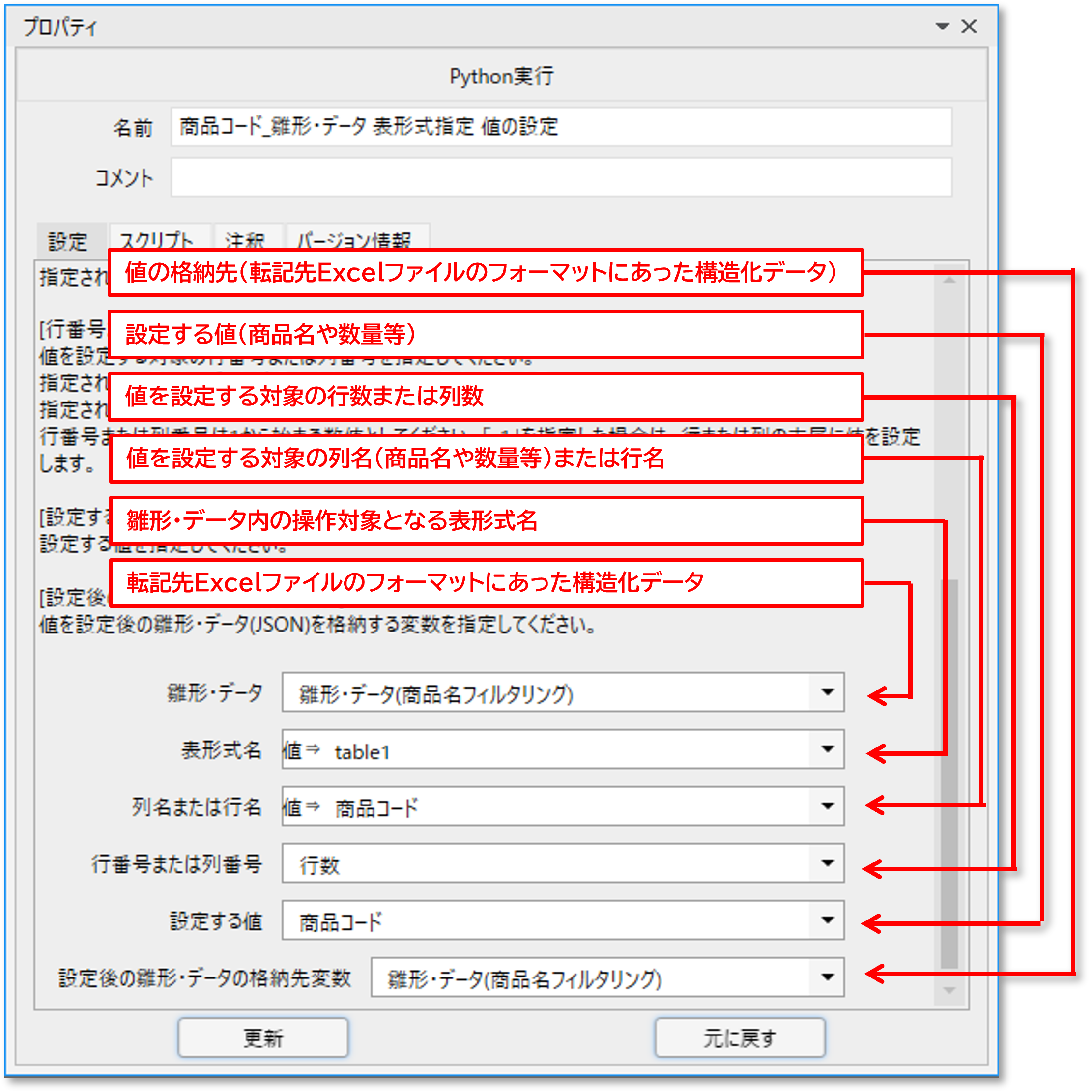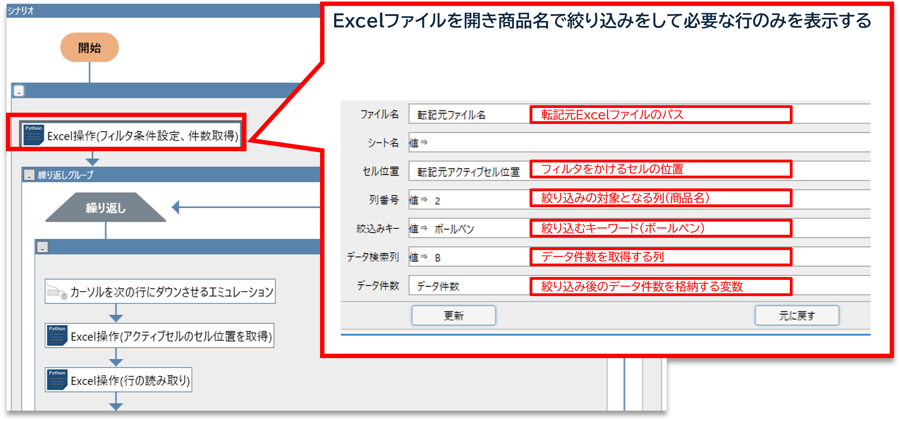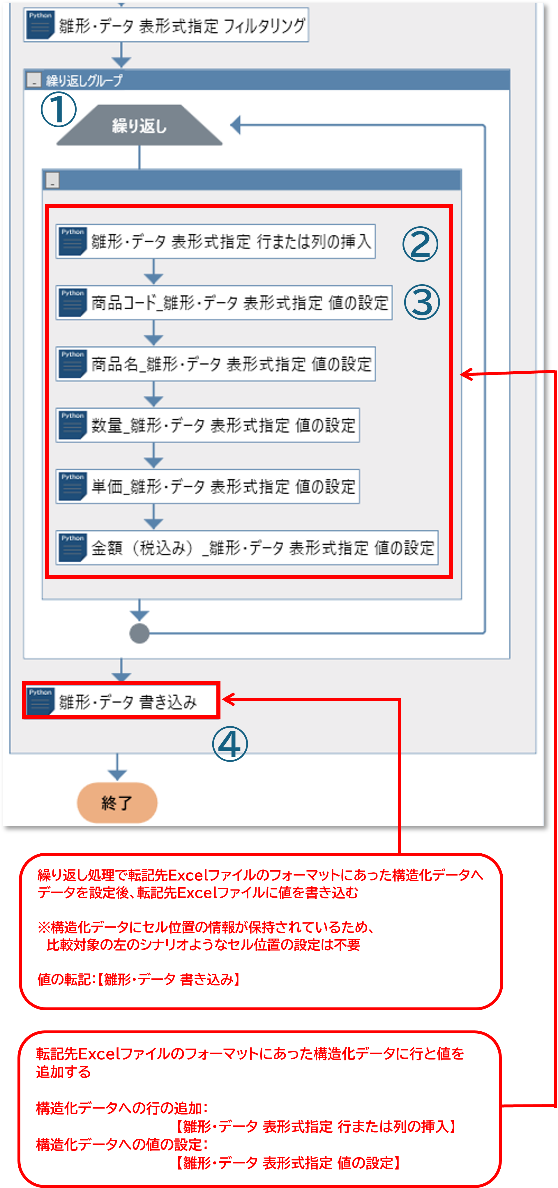 ③【雛形・データ 表形式指定 行または列の挿入】&【雛形・データ 表形式指定 値の設定】 転記先Excelファイルに合った(上記①の構造化データとは別の新たな)構造化データに行の追加とデータを格納する ④【雛形・データ 書き込み】 転記先Excelファイルに構造化データ(商品名が「ボールペン」のみ)のデータを一括で書き込む |