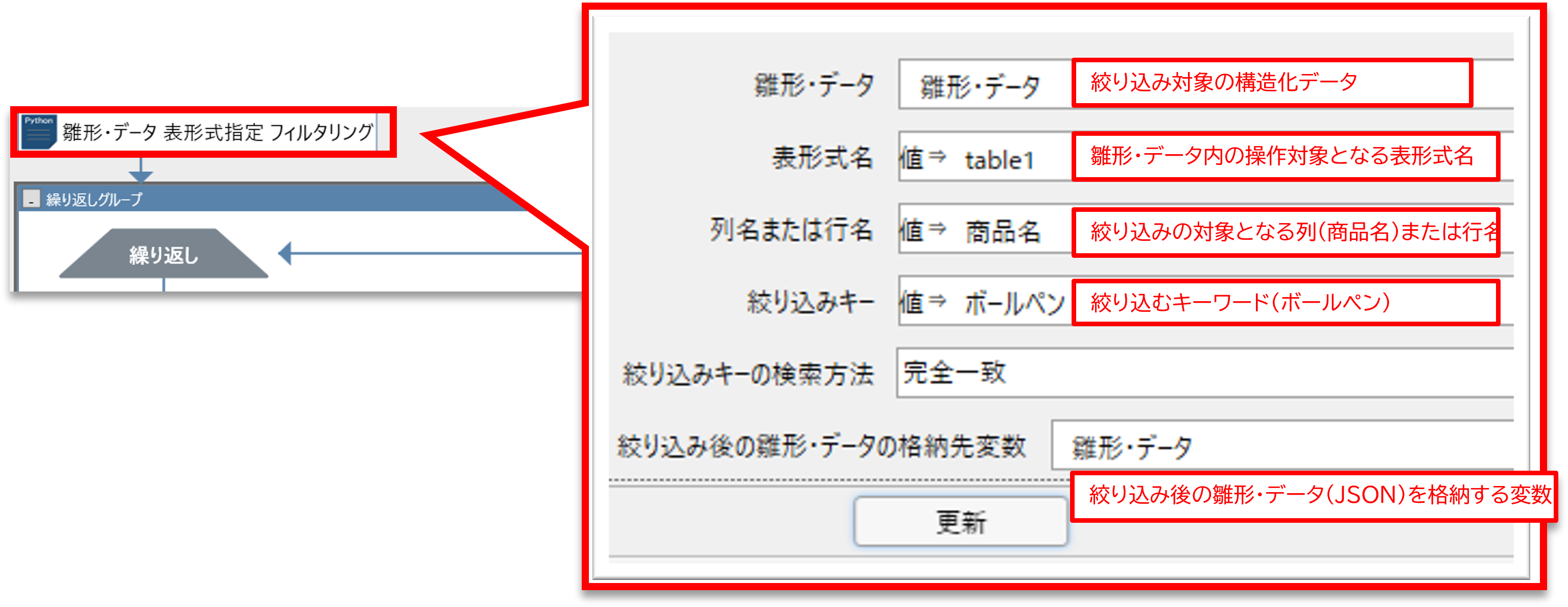 ②【雛形・データ 表形式指定 フィルタリング】 格納された構造化データからさらに商品名が「ボールペン」のみのデータに絞り込む |