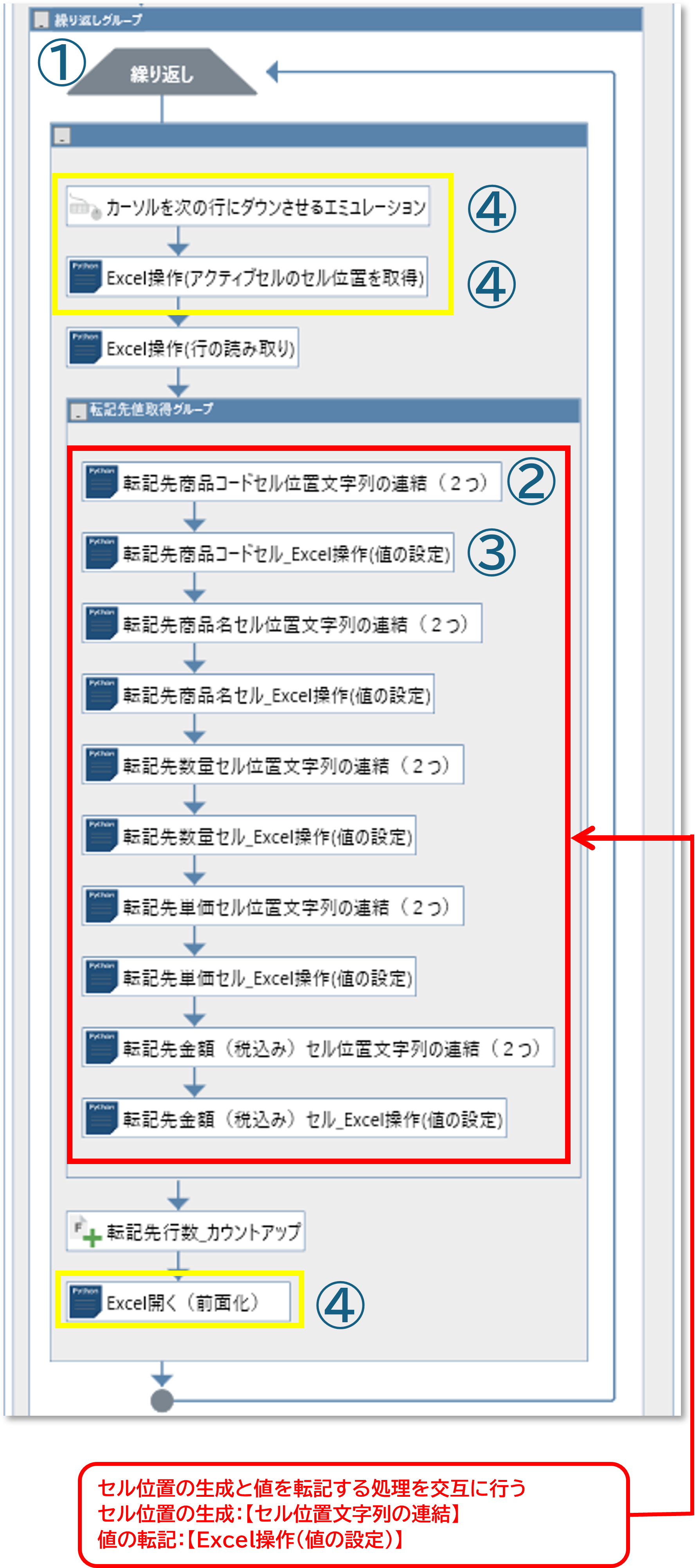 ②【エミュレーション】&【Excel操作(アクティブセルのセル位置を取得)】 転記元Excelファイルの値を読み込むため、カーソルを1行下に移動させてセルの位置を取得する ③【Excel操作(行の読み取り)】 カーソル位置の行の値(商品コード、商品名、数量、単価、金額(税込み))を取得し、各変数へ格納する ④【セル位置文字列の連結(2つ)】&【Excel操作(値の設定)】 転記先Excelファイルのセル位置を生成して、ファイルへ各変数の値を転記する ⑤【カウントアップ】 転記先Excelファイルの次の行に値を転記するため、行の変数をカウントアップする ⑥【Excel開く(前面化)】 カーソル移動(②)をするため、転記元Excelファイルの前面化する。 |